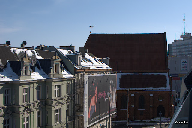 Ale to tak dygresyjnie. Nowa galeria handlowo-parkingowa w centrum miasta cieszy mnie bardzo. Zupełnie nie z zakupowego punktu widzenia, bo w środku te same sklepy co gdzie indziej (chociaż Lidl w centrum - miła rzecz), ale z dwóch powodów, nazwijmy to, miejskich. Zniknął ohydny, szpecący centrum blaszak, stanowiący wzbogacony "bazarek" i zniknęła trwająca kilka ładnych lat budowa. Są w zamian miejsca parkingowe pod ziemią, przez co jest szansa, że jakaś część parkujących w okolicach Starego Rynku zejdzie do podziemia. I jest całkiem zgrabny architektonicznie budynek, z dużą ilością szkła, w którym ładnie się odbija stojący obok pałac Anderschów. I z tarasem widokowym, z którego wprawdzie nie ma aż tak spektakularnego widoku jak z Okrąglaka czy może-kiedyś-zakończonego Zamku na Górze Przemysła, ale zawsze coś.
