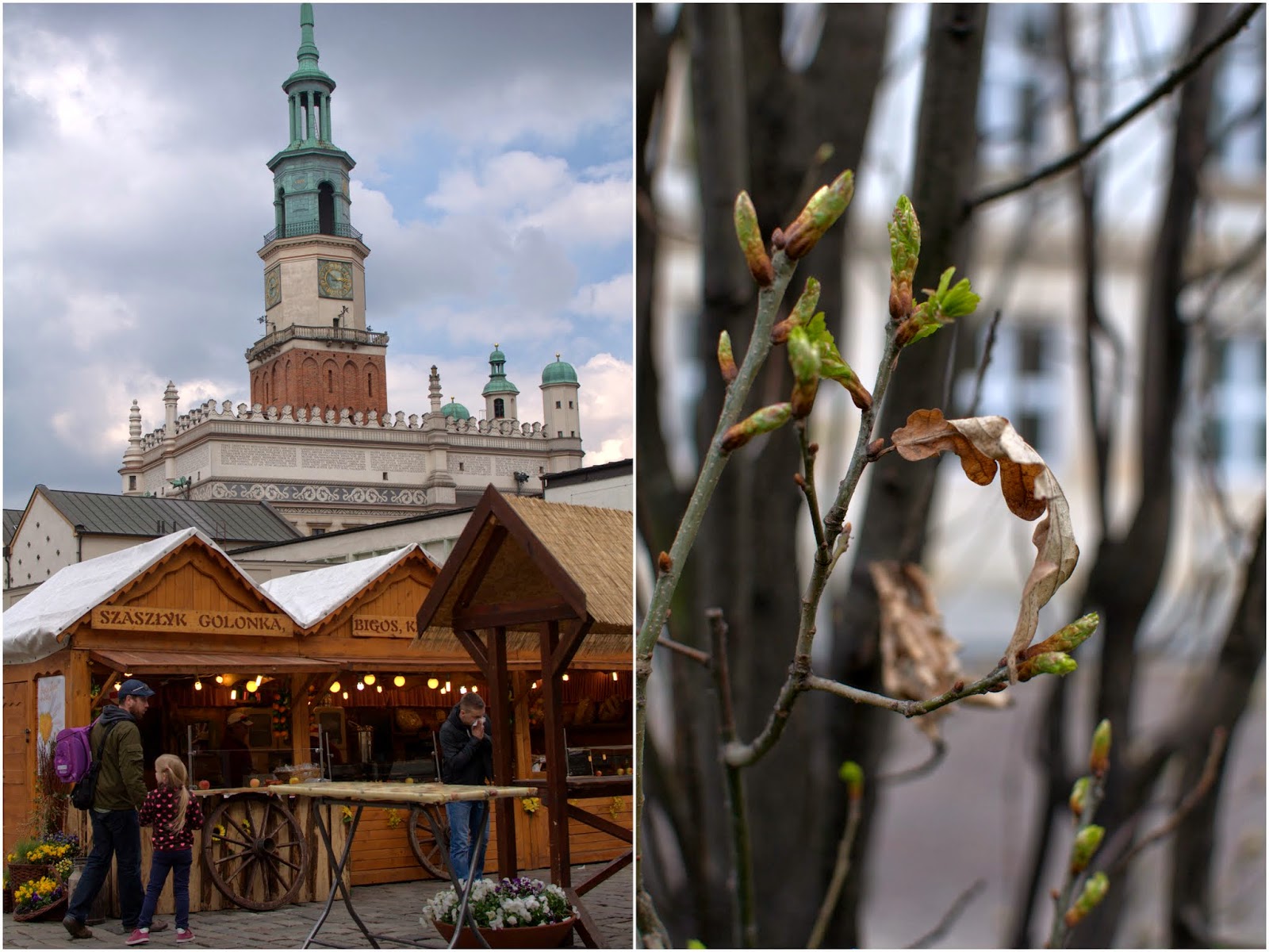 W tym roku miasto zakwitło bratkiem i tulipanem. Na Rynku ubogie stragany przedświąteczne i - ponieważ wiosna w tym roku łaskawa (sprawdzić, czy akurat nie pada grad) - ogródki piwne. Lubię co roku zobaczyć, co się zmieniło po zimie. Czy Golem dalej stoi na Alejach Marcinkowskiego (stoi), czy jest już woda w fontannie z żabami (nie) albo w studni z lewkiem pod Biblioteką Raczyńskich (dalej nie) oraz czy na nowym kwietniku przy placu Wolności coś się pojawiło (tak). I niebo. Na zmianę błękitne i z obłokami albo - jak wczoraj - kobaltowo-sine, kontrastujące ze świeżą, mocną zielenią świeżych liści. Niebo ma ode mnie lajka.