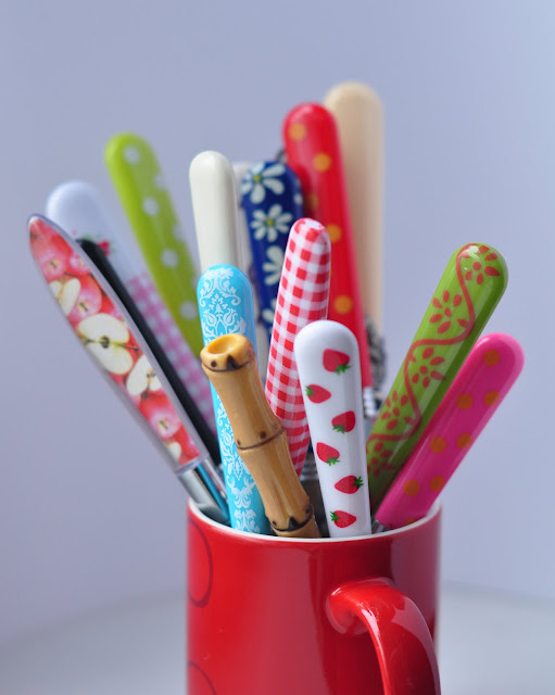 Z pewnym niepokojem oczekuję na weekend z jego wielkim zamieszaniem logistyczno-porządkowym. W międzyczasie odchwaszczam kolejną zaniedbaną grządkę kuchenną. Od lat zalegały mi w kuchni stare sztućce z odzysku, na plastikowym wieszaku. Używane głównie do mieszania w garnkach i bardzo awaryjnie, jak już wszystkie inne były brudne; wstydliwie schowane za maszynę do pieczenia chleba. Od dawna chodziłam dookoła ślicznych, kolorowych i uroczo niekompletnych sztućców, ale cały czas tłumaczyłam sobie, że tamte jeszcze sprawne. Ostatnio jednak, przygnieciona szarością za oknem, dodatkowo też zmotywowana przez H., kliknęłam. Wybaczam kurierowi nawet to, że obudził naszą trójkę po ciężko wypracowanym śnie o 9:25, bo otwierając pudełko czułam się jak siedmiolatka, która dostała paczkę z cukierkami[1].