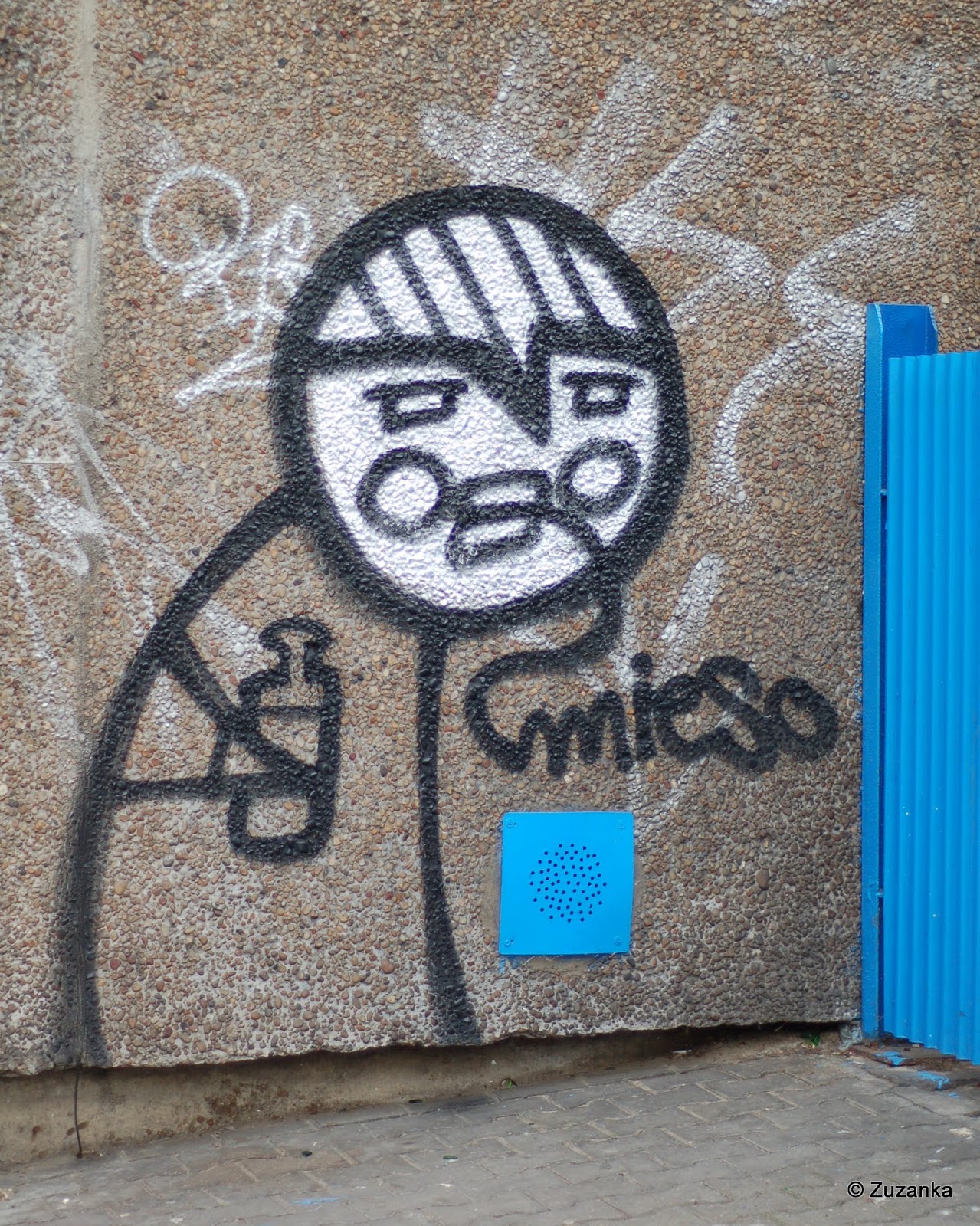 Tylko za kotami rozglądam się z jednakową ciekawością. Dziś widziałam biało-czarnego zadekowanego na sjestę pod krzakiem i trzy szare, uprawiające jakieś tajemnicze kocie zajęcia pod kocim blokiem na Grunwaldzkiej. Jednego spłoszyłam włażąc na trawnik, żeby zrobić zdjęcie anty-gejowskiego graffiti. Nie wiem, co komu homoseksualista szkodzi.