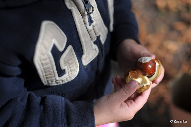 Weszliśmy z Majutem w specjalizację. Od pewnego momentu przestaliśmy zbierać wszystkie ładne kasztany, zaczęliśmy wybierać tylko te, które jeszcze były w skorupkach i można było je pracowicie wyłuskać (albo same wypadały). Nie wiem po co, ale mamy trzy koszyki kasztanów. I trochę żołędzi w czapeczkach. I trochę czarnego żwiru (to Majut, nie chciał zeznać, po co żwir, ale widać - trzeba).
