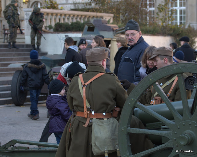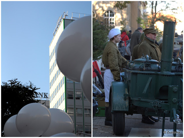Unikając zadrażnień międzyregionalnych, oględnie powiem tylko, że według mnie o wiele lepiej czuć się niepodległym, kiedy się ma paradę z jeżami, panią sprzątaczką, brązowymi konikami, wszędzie są balony, dzieci na barana na ramionach rodziców (czemuż, ach czemuż moich, skoro tatuś wyższy i silniejszy od mamusi?) i unosi się zapach rogali[1]. Jedyne akcenty militarne to panowie w zabytkowych mundurach, zielonoszary sprzęt, karabiny, z którymi niedorostki robią sobie zdjęcia, bo to zabawa, a nie wojna. I słój kiszonych obok kuchni polowej. Na zdjęciach widać, że ulica Święty Marcin powinna być deptakiem, że powinny zniknąć z niej banki, bo ludzie chcą wychodzić i się spotykać, nawet jak jest zimno[2].