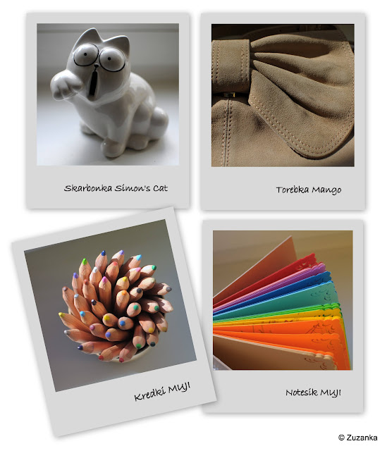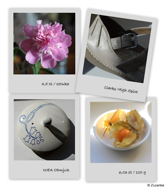 Bo jak jednym słowem opisać moje pełne nadziei oczekiwanie na Dzień Dziecka, kiedy Maj rozpakuje skarbonkę w kształcie Kota Simona? Jak zbudować zdania, opisujące świeżość zapachu różowej piwonii (a wcześniej wizytę w kwiaciarni, kiedy wśród kilkunastu gatunków kwiatów muszę wybrać ten jeden)?. Zapach skóry nowej torebki, układ fałd tworzących kokardę; poczucie, że jest dla mnie za elegancka (i złośliwy komentarz TŻ-a, że jak będę wreszcie miała okazję z nią wyjść, to jej nie będę mogła znaleźć)? Smak i zapach pomarańczowego owocu physalisu, który kupiłam zamiast brzydkich truskawek? Wygodę nowych pantofelków z paseczkami i fikuśnie wycinanymi brzegami skórki i kwiatkiem na podeszwie? Przyjemność nalewania aromatycznej herbaty, kupionej specjalnie dla mnie przez TŻ-a; stary czajnik rozlewał, a poza tym pojawiły się na nim złowieszcze pęknięcia - nowy i zupełnie niedrogi kremowy z niebieskim wzorkiem jest stabilny i nalewa szerokim, pewnym strumieniem. Czy wreszcie widok Mai zaangażowanej w rysowanie małymi kredkami w 36 kolorach w kolorowym notesiku, którego brzegi mozolnie powycinałam we wzorki dziurkaczem z Tchibo? Brakuje mi przymiotników, związków frazeologicznych i lingwistycznego kleju, żeby to wszystko połączyć.