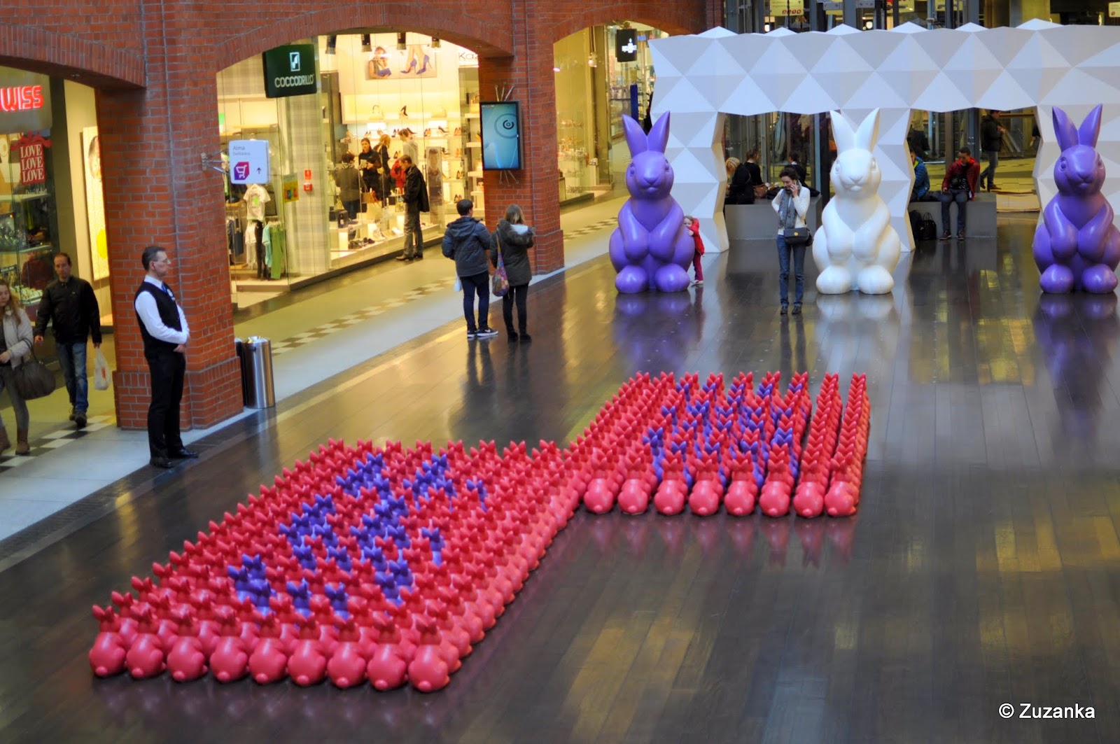 ... ta wiosna w tym roku. Niby ciepło, niby słonko, ale rok temu o tej porze kwitły już drzewa owocowe i mam na to twarde dowody fotograficzne. Nie eskaluję, ale mogłaby się wiosna ogarnąć, bo ja już chcę wyprać i zdeponować zimową odzież i obuwie, a nie że co chwila wracać do ciepłej kurtki. Stary Browar nie ociąga się przynajmniej i zające również i w tym roku wyroiły. Jak na aktywną matkę przystało, pobiegłam zapisać dziecko na warsztaty malowania zajęcy, z których wróciło szczęśliwe (choć nieco brudne) z ozdobioną złotym akrylem figurką. W przedszkolu kolejny kiermasz, wzbogacający kulturalnie za sprawą sztuki dla nieletnich, w której jajko dokonywało striptease'u à rebours, zakładając dziób i skrzydełka po wykluciu się z jajka, co referował z kamienną twarzą narrator (w cywilu TŻ). Mnie się ani kamiennej twarzy nie udało utrzymać, ani kamiennych rąk, więc film nakręcony z ręki się nieco czasem trzęsie (a statywy są dla mięczaków).