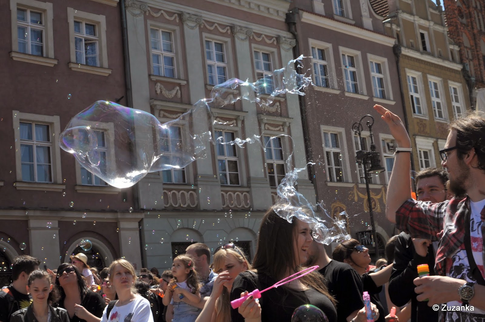 Nie pamiętam, czemu nie byliśmy rok temu, ale dziś było dość tłoczno, od nie pamiętam od jak dawna udało nam się dotrzeć akurat na koziołki o 12, więc tłoczno podwójnie. Do tego pani na gesangu, nachalnie zanęcająca wszystkich do puszczania baniek na komendę i do świetnej zabawy, też nie pomagała. Więc może dlatego. Maj był zaaferowany, łapał bańki, dmuchał, ale za dużo, za głośno, za ludnie.