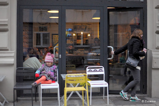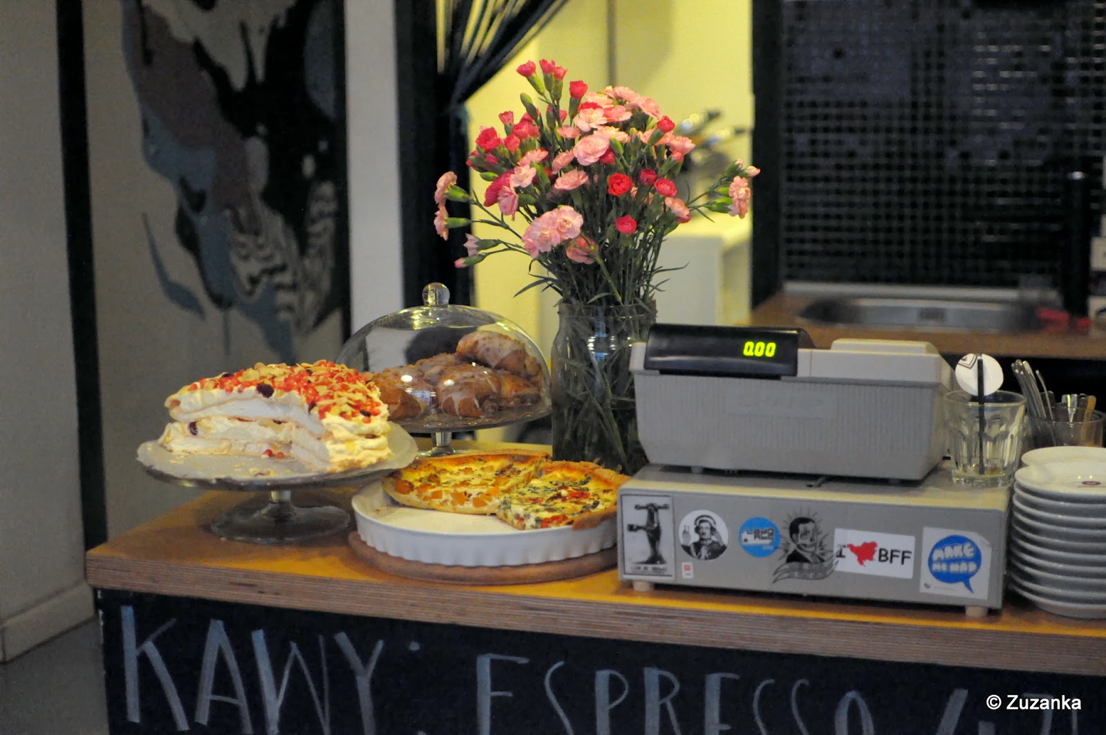 ... kawa i świetne kanapki na Taczaka 20, dla mnie łosoś z kaparami, rukolą, ogórkiem i lekko kwaśnym sosem, dla TŻ grillowana kanapka z kurczakiem, pomidorem i zieleniną, którą wyjadał mu Majut, na zmianę informując, że pysne oraz że smakuje jak siano ("a gdzie ty próbowałaś siana, kochanie?"). Taczaka 20 to zagospodarowana brama, malutka knajpka na dosłownie kilka stolików z letnim potencjałem na więcej na ulicy. Adapter z płytami, pod sufitem rower, Fritz Kola, słychać "Diamonds&Pearls" Prince'a, certyfikowane rogale, tort bezowy z granatami i specjalność zakładu - Przysmak Generała Taczaka (czekoladowe ciasto, mascarpone, karmel). Gwarnie, zacisznie i miło. Jak na spotkaniu, na którym wprawdzie się nikogo nie zna, ale za chwilę można poznać.