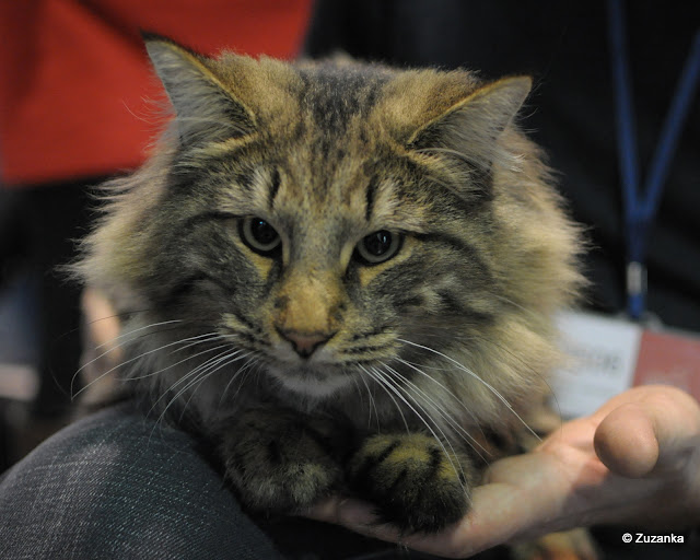 Najlepsze koty to - poza moimi - oczywiście dachowe, zwane krótkowłosymi europejskimi. Ale jak już do Poznania zjechał mi z całego świata tłum ludzi z tłumem miękkich, puszystych, kolorowych i pięknych kotów, to - mimo dotychczasowej niechęci - poszłam pokazać dziecku kotki (a przynajmniej tak to się oficjalnie nazywa, bo młodzież się znudziła po godzinie, a ja wróciłam następnego dnia). Niechęć trochę mi wystawa przełamała, bo koty wyglądały na znudzone i senne, ale nie zestresowane i w złej formie. Za kratami, ale to kraty dla ich komfortu.