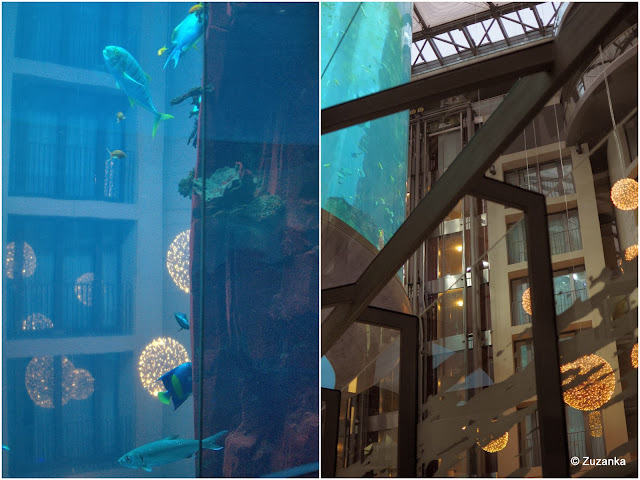 Akwarium w hotelu Radisson, z którym Sea Life sąsiaduje (wizyta w pakiecie), rozczarowało mnie niezmiernie. Nakręcona zdjęciami z sieci spodziewałam się ogromnego cylindra, pełnego ładnie zaaranżowanych ryb. Niestety, cylinder jest dość brudny, ryb niespecjalnie dużo, wjeżdża się do środka windą, która słabo się nadaje nawet do oglądania, nie wspominając o fotografowaniu. Miłe, ale nie warto się nastawiać.