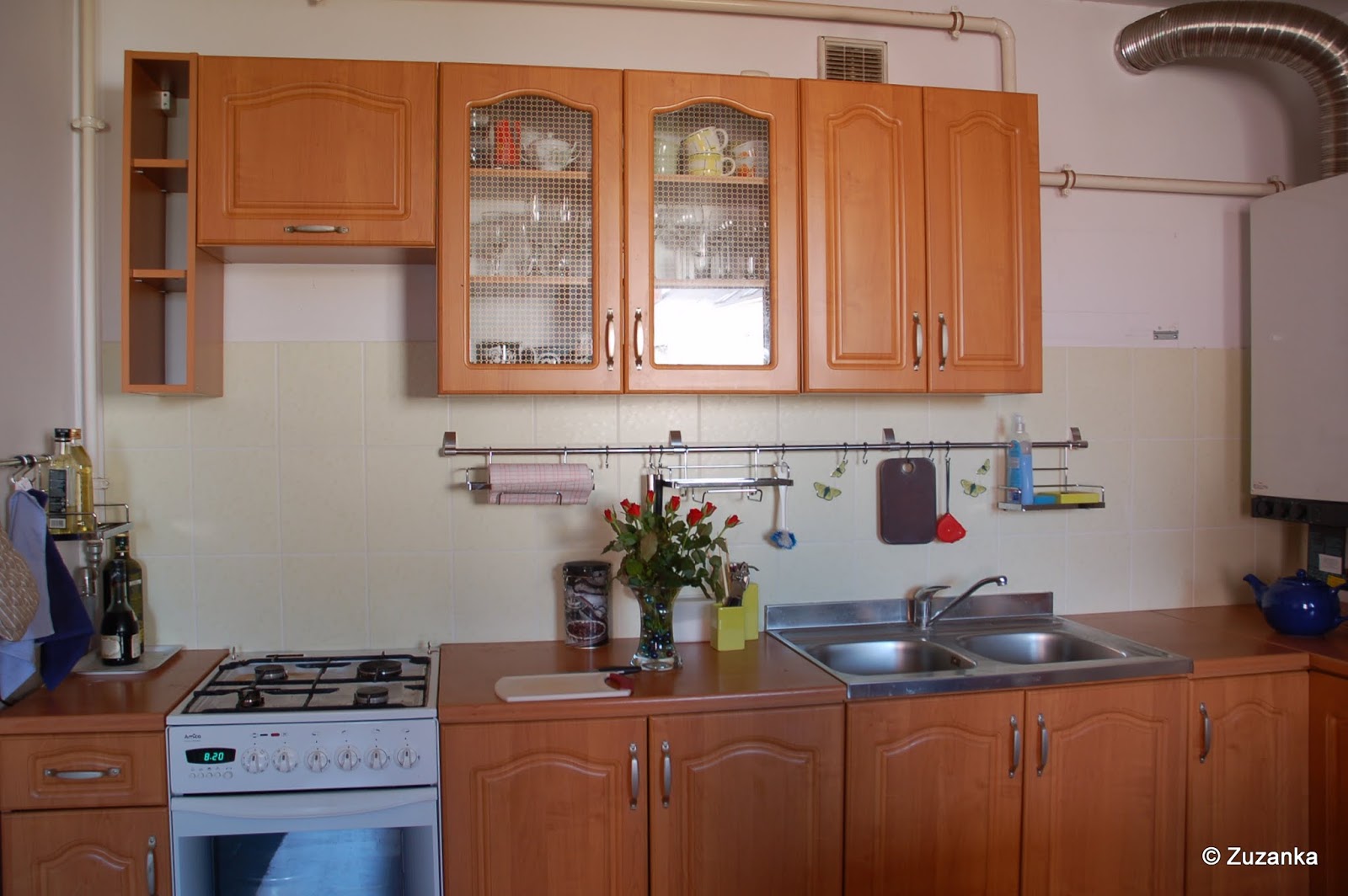 ... ogarnęłam nieco kuchnię. Kafelki w motylki - checked. Relingi - checked (sąsiad przyszedł z wiertarą i powiesił, hail sąsiad). Pojemniczki z brabantia.pl - checked. Kot na szafce, wąchający relingi - checked. Pojemniczki na przyprawy - checked. Opanowanie bałaganu porozwałkowego - checked.
