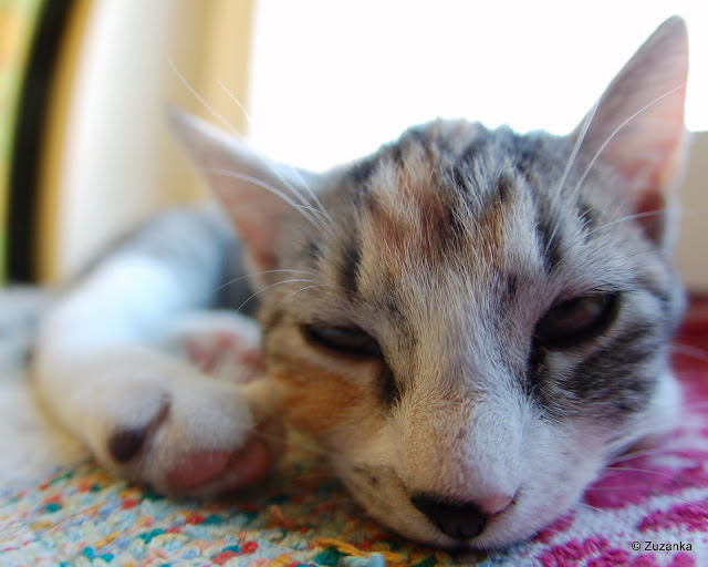 Fajnie mieć małe koty. Nawet jeśli mają niepofałdowany jeszcze mózg (duże słowo), są ciągle pod nogami i co chwila trzeba je zdejmować z kolejnego Miejsca, W Którym Nie Powinny Być (krzesło - checked, zasłonka - checked, zmywarka - checked, kolumny - checked, parapet - checked, garderoba - checked, suszarka do bielizny - checked, brodzik - checked). Pewnie jakby nie były takie śliczne, to bym wywiesiła za futrzane ogonki na balkonie (C Hanka). Ale nic nie poradzę na to, że mam takie miękkie miejsce w serduszku dla kocich łapek, brzuszków i ogromnych różowych uszek. I bardzo się cieszę, widząc Szarszą wtuloną w Burszą i vice versa. Chciałabym kiedyś zobaczyć obie wtulone w kota czarno-białego.