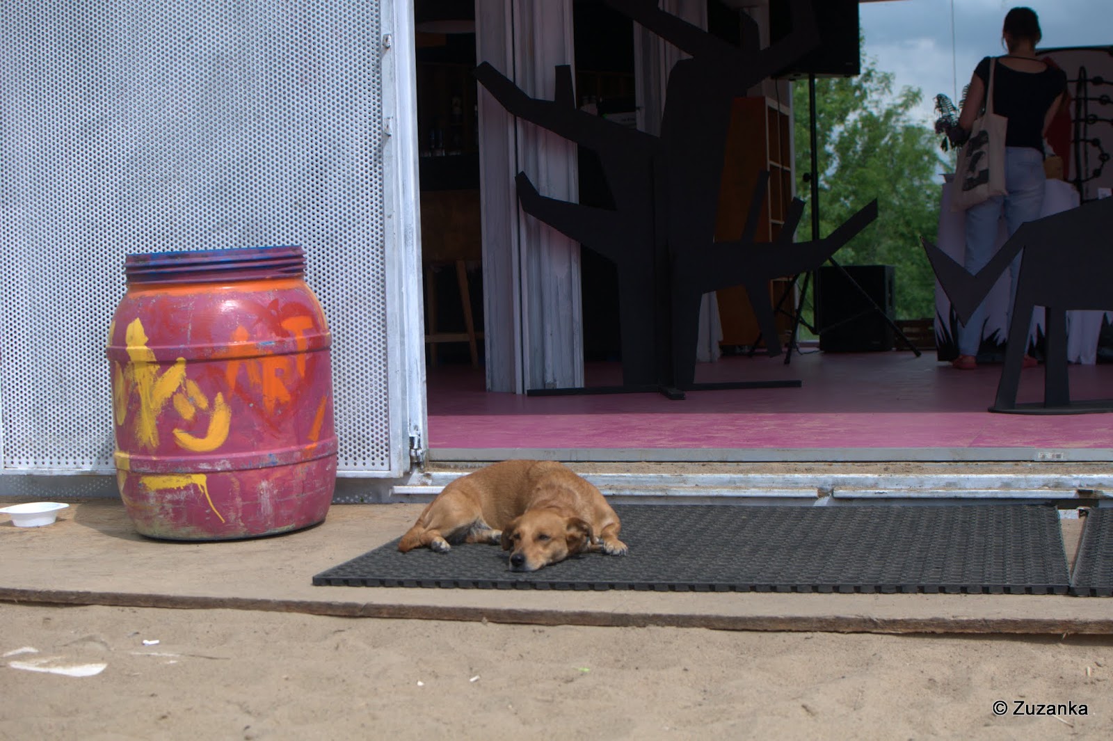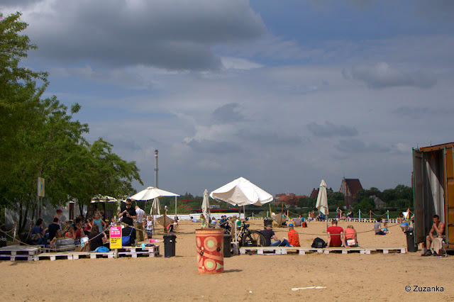 Wyjątkowo udało mi się dotrzymać danej sobie obietnicy, bo z tym u mnie przeraźliwie krucho, i pojechałam obejrzeć poznańskie wydanie Restaurant Day. Cała rodzina zachwycona - Maj grzebała w piasku i skakała na kanapie, TŻ dostał wegańskie ciasto z rabarbarem i Fritz Kolę, a ja widok na sporą część mojego poznańskiego startu - Wartę, most Rocha i Politechnikę Poznańską. W KontenerART (-arcie?) byłam po raz pierwszy i chyba polubiłam mimo tymczasowości miejsca (a może właśnie dzięki temu?). Na piasku, rozsypanym między kolorowymi kontenerami, na paletach i oponach, kłębił się tłum dzieci, psów i dorosłych w różnym wieku. Ludzie w mieście chcą być razem, chcą przestrzeni bez samochodów, tylko na relaks. I to jest to miejsce. Scena, na której można skakać, bębny do bębnienia i jedzenie, którego nie można dostać gdzie indziej. Idea Restaurant Day jest taka, że otwiera się restaurację na jeden dzień i sprzedaje coś, co się przygotowało - ciasta, przekąski, warzywa, hummus, kanapki. I ta idea do mnie bardzo przemawia. Następna odsłona 18 sierpnia, polecam.