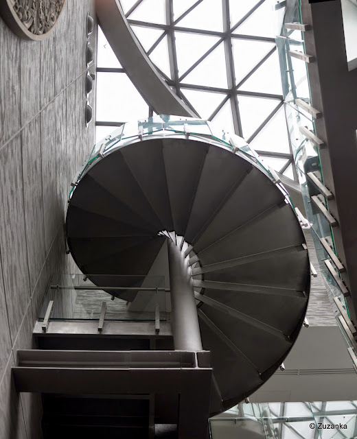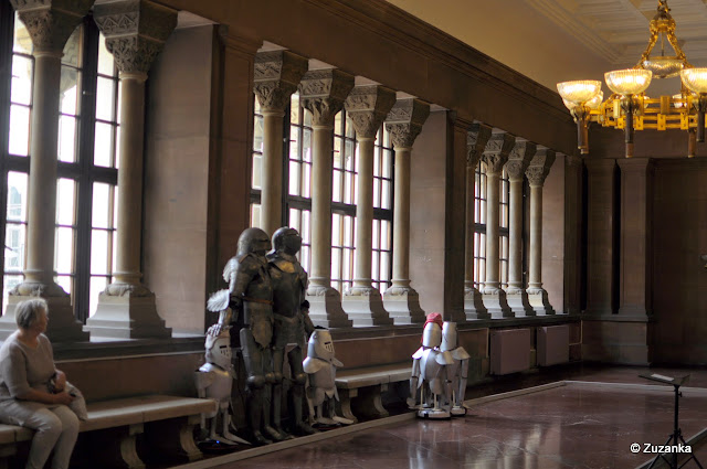 Wyasygnowałam całe 5 zł, dokonawszy z wyprzedzeniem rezerwacji[2] i zabrałam córkę moją do Zamku Cesarskiego. Po kawie i ciasteczku w Świetlicy (II piętro pod kopułą, zdecydowanie remont wyszedł Zamkowi na plus) młodzież zjechała po ogromnym nadmuchiwanym krokodylu, sięgającym prawie że kawiarni, dostała poduszkę do siedzenia i - ponieważ chwilę wcześniej zobaczyła koleżankę z przedszkola idącą w inne miejsce - jak kot na spacerze niechętnie powlokła się za przewodniczką. Trasa jest dla dzieci - w każdej sali można usiąść i posłuchać, treść jest dopasowana do wieku - o windach, cesarzach, prądzie i o tym, czy do Zamku dało się wjechać samochodem. Nie żeby młodzież szczególnie doceniała, albowiem zajmowała się jojczeniem, że już chce wyjść, ale parę drobiazgów - szukanie na marmurowej posadzce amonitów, schodów i mozajek na suficie, zbroje jeżdżące na robotach - sprawiało, że jednak była to jakaś przyjemność dla niezbyt dorosłej dziewczyny (dla rocznej dziewczynki, jej matki i reszty wycieczki mniej, albowiem roczniak ma mały attention span, a spore możliwości wokalne). Szczegóły typu, że Zamek zbudował sobie Cesarz Wilhelm II, ale w nim niespecjalnie bywał, a w kaplicy przygotowano gabinet dla Hitlera, który na szczęście nie zaszczycił, pewnie się nie zachowają, ale nie szkodzi.