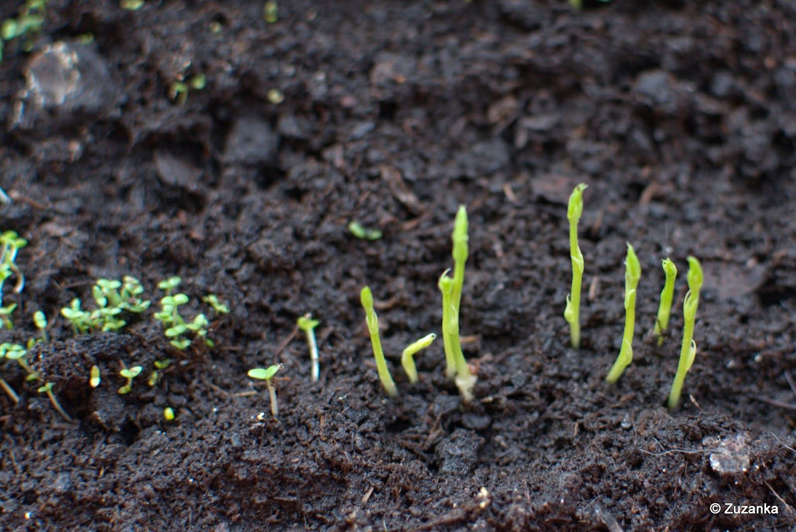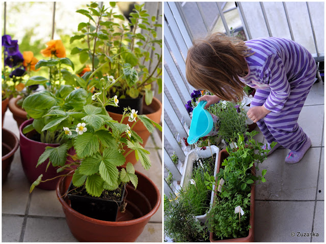 10/11 maja. Z Targu Śniadaniowego przyniosłam posadzone przez Maja lewkonie, różową sałatę, dalie i dynię (dynia przeze mnie, nie mogłam się powstrzymać). A rzodkiewka już zjedzona.