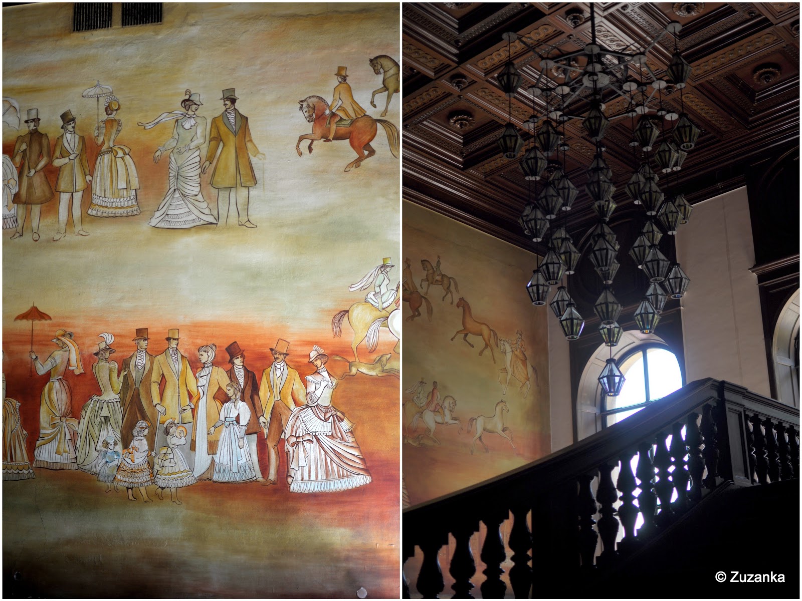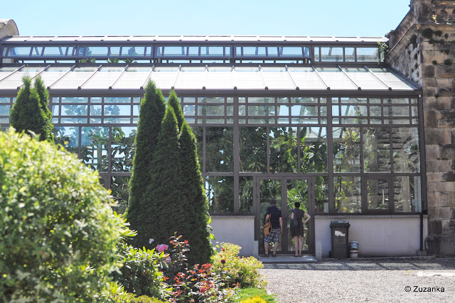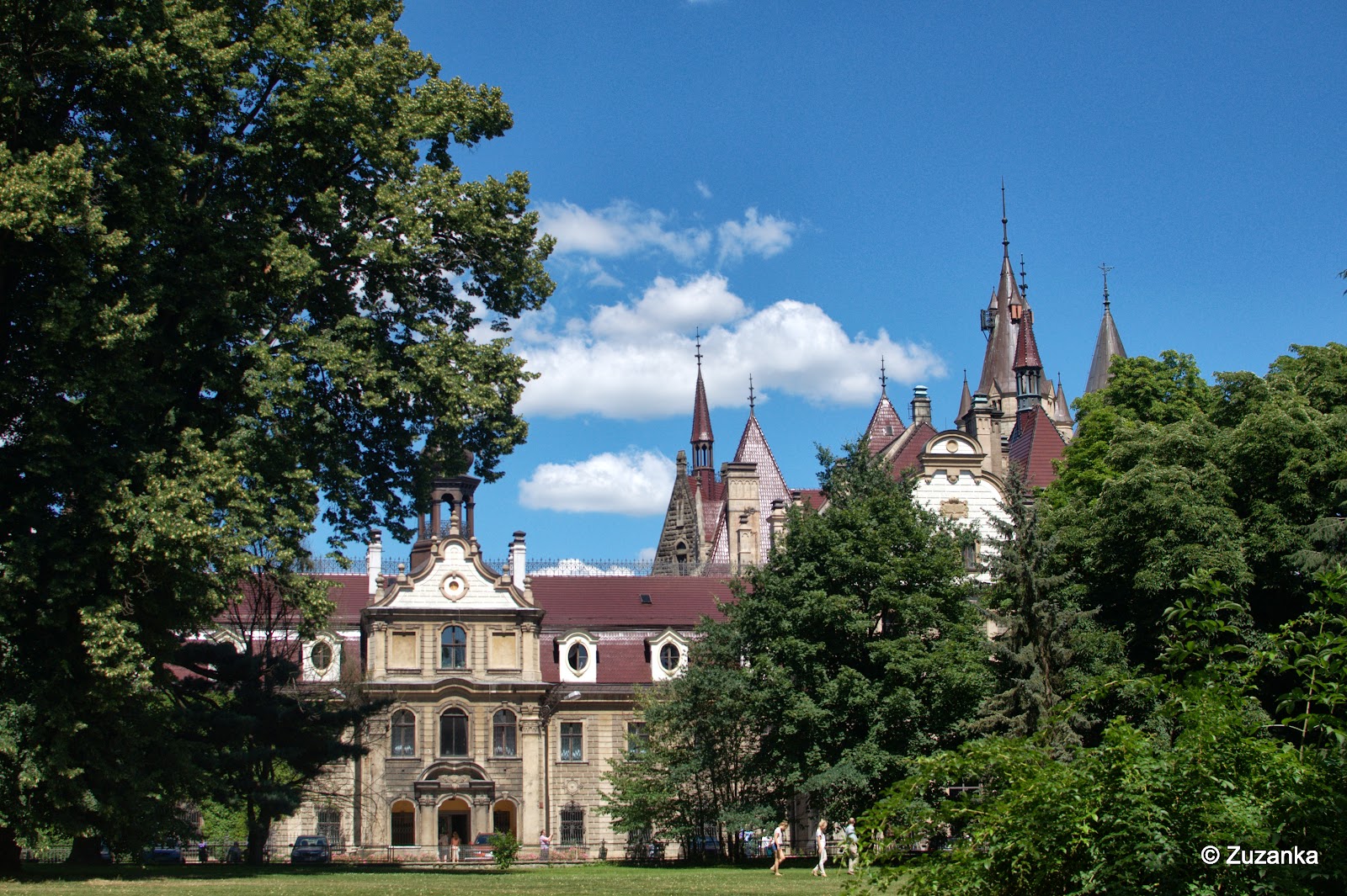 Więc pomijając lingwistyczną pułapkę (bo lokalizacja zamku odmienia się nie tak, jak homonim), naprawdę warto zakochać się w Mosznej. Wprawdzie nie ogarniam jak pacjenci Centrum Terapii Nerwic Moszna-Zamek leczą sobie te nerwice z setkami turystów w pałacu parku i przylegającej stadninie, ale może - jak celnie zauważyła H. - trzymają ich w lochach i wypuszczają, jak wyjdą ostatni turyści. Bo są lochy, chociaż ich z zewnątrz nie widać. Widać za to wieże. Mnóstwo wież, każda inna, a niektóre ściany ze spokojem mogłyby robić za hanzeatyckie kamieniczki. Na ścianach wmurowana zwierzyna (dziki, bardzo zaskoczony niedźwiedź), z okna malowniczo zwisa szkielet, na podwórku lew wyglądający nawet dość godnie i drugi - tak już zupełnie głupio. W parku przeważnie komary, mimo upału, więc albo się idzie w słońcu i smaży jak na patelni, albo gryzą. I jest oranżeria, ale zamknięta. Chociaż może to i dobrze przy 32 stopniach celsjusza.