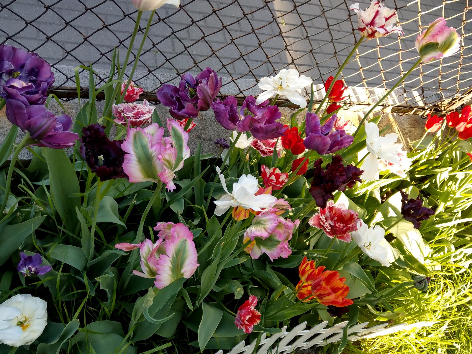 Jak wcześniej, inwestowałam w tulipany (oprócz, wiadomo, hiacyntów, krokusów, żonkili i innego drobiazgu). Nie podejmuję się oceniać, czy wszystkie wyrosły ani dopasowywać nazw do moich zdjęć. Niesamowicie mnie wszystkie cieszyły, od połowy kwietnia do połowy maja; nawet przekwitnięte były obłędnie piękne. Notatka ku pamięci - oprócz tych, co przeżyły z poprzedniego roku (a dalece nie wszystkie, część - mimo że wykopana w czerwcu i wsadzona w październiku - wypuściła tylko puste liście), kupiłam odmiany: Flaming Parrot (czerwono-pomarańczowy), Parrot (biało-zielony), Black Parrot (ciemnoczerwony), Virichic (wąski zielono-różowy), Foxtrot (biało-różowy pełny), Freeman (pomarańczowo-zielony), Brest (blado-czerwony strzępiasty), Mount Tacoma (biały pełny), Green Wave (papuzi różowo-zielony, powykręcany), Ice Cream (biały czubek na czerwono-zielonej podstawie), Green River (wąski zielono-różowy w paski), Little Beauty (niskie różowe z fioletowym środkiem), Doll's Minuet (niskie amarantowe z zielonym paskiem), Estella Rijnveld (czerwono-białe z zielonym paskiem), Exquist (fioletowo-zielony w kształcie kuli), Oviedo (biało-różowy strzępiasty), Thesire (ciemnoróżowy pełny), dwukolorowa mieszanka żółto-zielonych i różowo-zielonych, Lilac blue (jasnofioletowo-zielony w kształcie kuli), miks kolorowych odmian niskich, Bowl of Beauty (biało-żółty pełny) i Negrita Parrot (ciemnoróżowy strzępiasty).