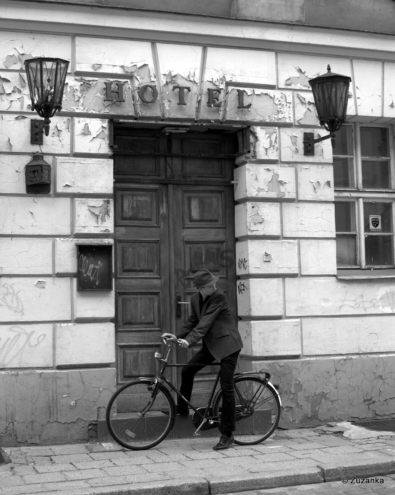 Ależ się ten pan świetnie wkomponował w te drzwi Domu Turysty...a swoja drogą, szkoda, ze tak długo stoi pusty....w takim miejscu...może anarchiści zajmą, to ktoś się zainteresuje:) ?