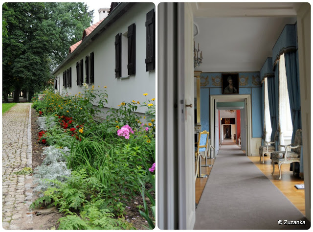 [1] Oraz, ha ha, tylko gotówka. Co przy dość słonych cenach i w przypadku większych grup jest dość niesprytne. Zadłużyliśmy się u teściów za bilety. Dzieci do lat 7 - gratis. Biletowane jest wszystko - powozownia, pałac, galeria - poza parkiem. Zwiedza się w 25-osobowych grupach, wpuszczanych co 30 minut. Parku tym razem nie przespacerowaliśmy, albowiem się nagle rozpadało (ale upał nie zelżał).