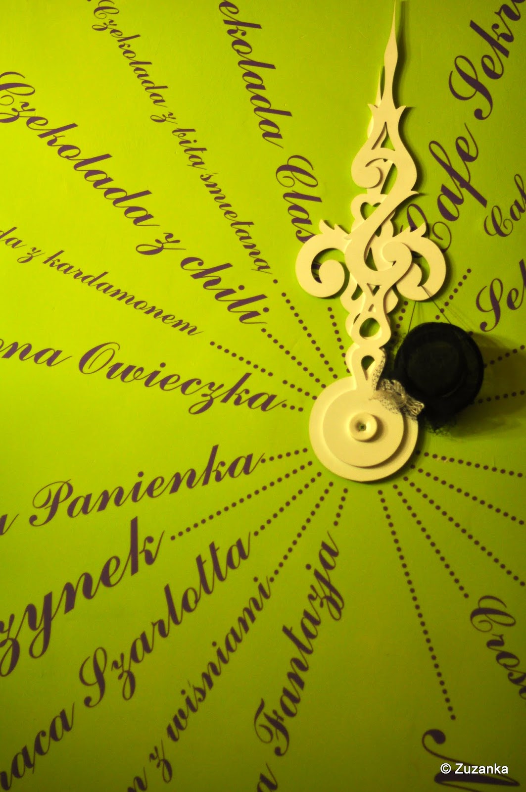 Do Cafe Sekret wybierałam się już dawno, zanęcona kilkoma niezłymi recenzjami i kilkoma zerknięciami za szybę. I zaiste, ładnie było. Konsekwentne użycie lawendowego fioletu i mocnej zieleni z wycinanymi z białej sklejki fantazyjnymi zegarami bardzo przyjemne (w piwnicy inne kolory, ale też zgrabnie poukładane).