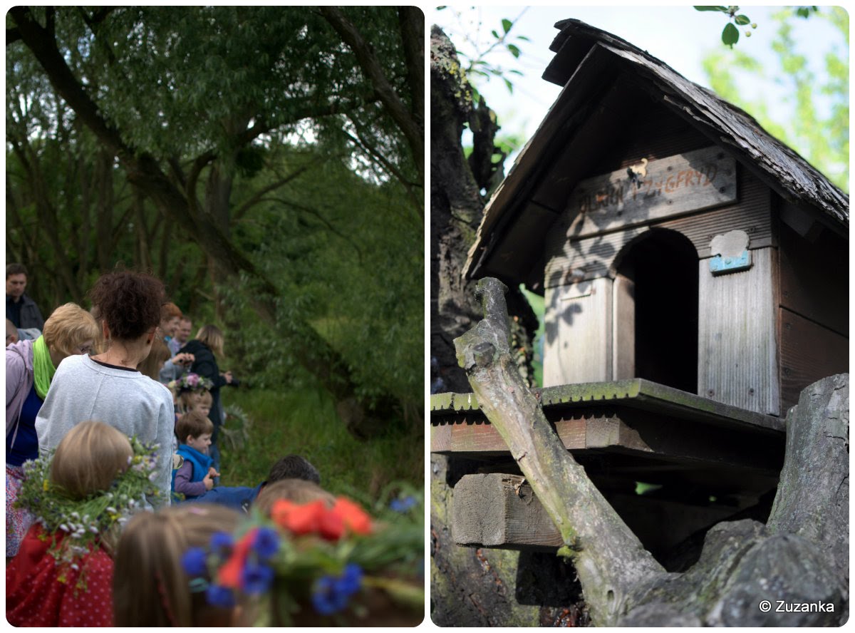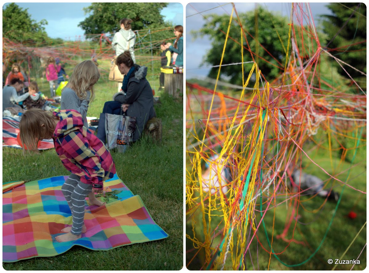 Inne miejsce tym razem i wielki foch wśród kilkorga rodziców, że termin, znany od września, jednak nie pasuje. Sądząc po frekwencji, jednak pasował. Mimo nagłych ataków ulewnego deszczu, owocujących przemoczeniem odzieży i obuwia niektórych, ale boso też dało się po mokrej trawie biegać; wyjątkowo chłodny czerwiec tego roku. Wprawdzie nie było przedstawienia, ale mama A. zorganizowała setkę kłębków wełny i wtem cała okolica okazała się plątaniną kolorowych nitek, które atakowały znienacka, zahaczały i czasem zwalały z nóg, zwłaszcza mniej sprawnych w chodzeniu.