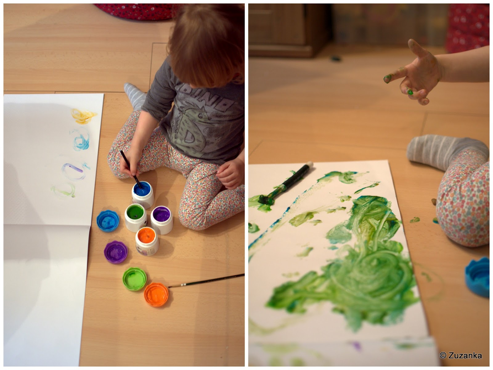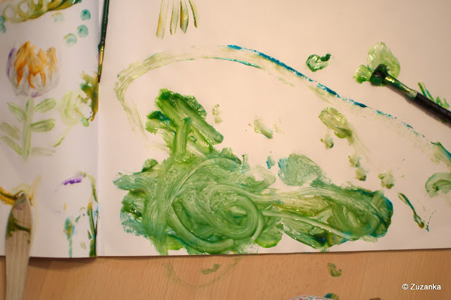 Ale ja nie o tym. Padało, a w czasie deszczu nawet nie tyle dzieci się nudzą, tylko jęczą, marudzą i chcą się bawić tylko z interaktywną zabawką o nazwie kodowej M.A.M.A. Dzięki fantastycznej cioci Hance, która zaopatrzyła Maja w całą torbę wszelkich dóbr, dostałam chwilę na herbatę, kiedy latorośl malowała farbami. Wprawdzie to były farby do malowania palcami, ale musiałam pożegnać się z dwoma pędzelkami do makijażu (krótki żal, i tak mi nie wychodzi). Za to mam kilka dzieł, jedno przedstawia wsistkie kojoji, mamusiu, a drugie - moim zdaniem - wygląda jak katapulta z brokuła.
