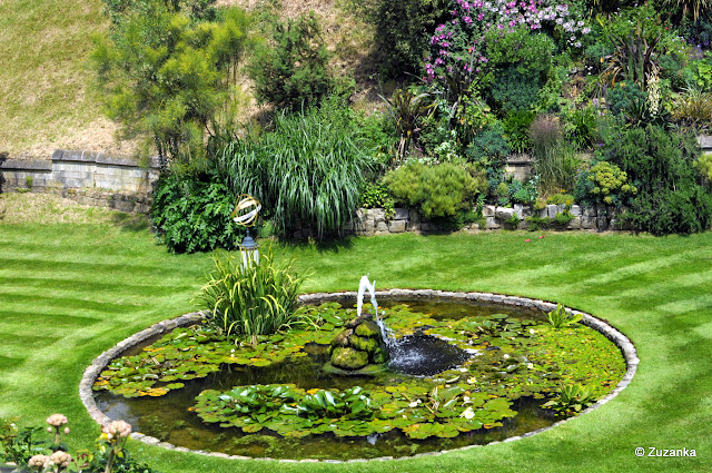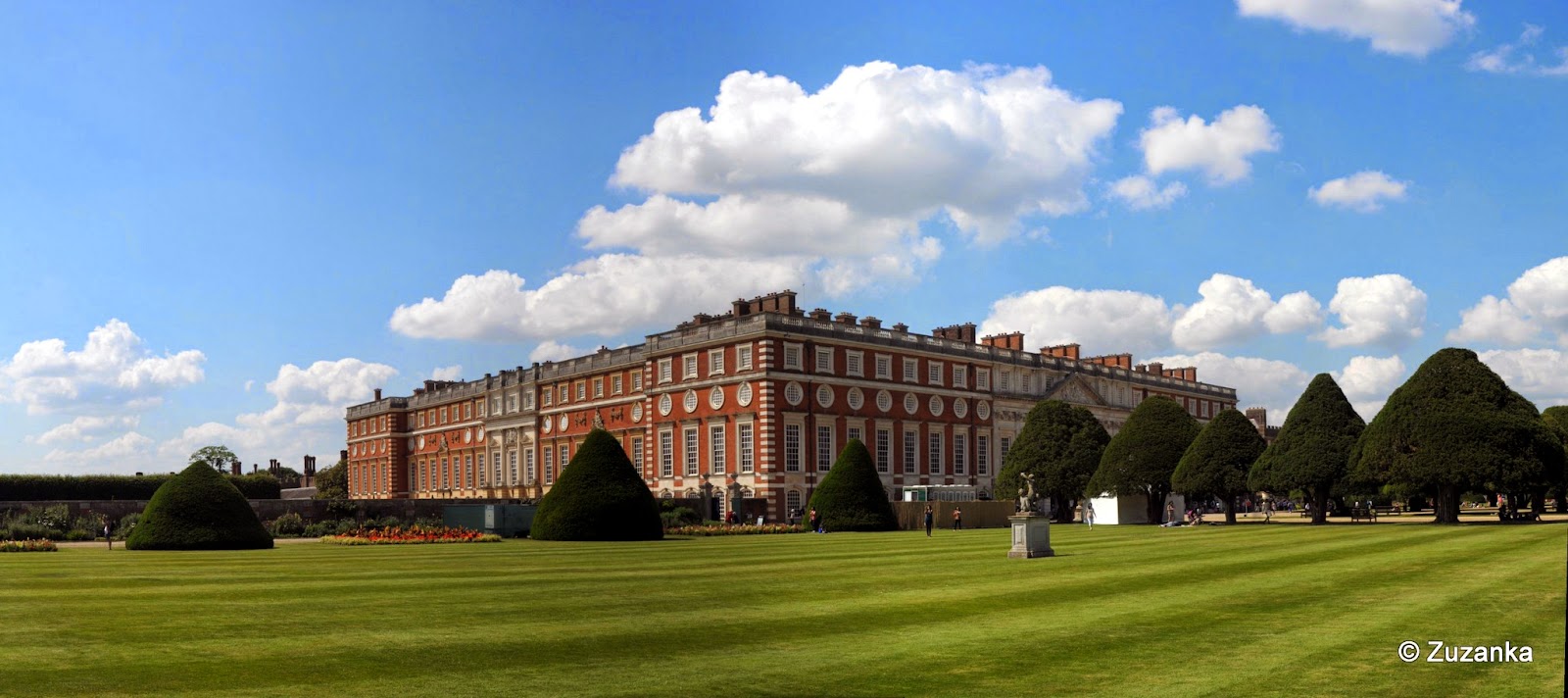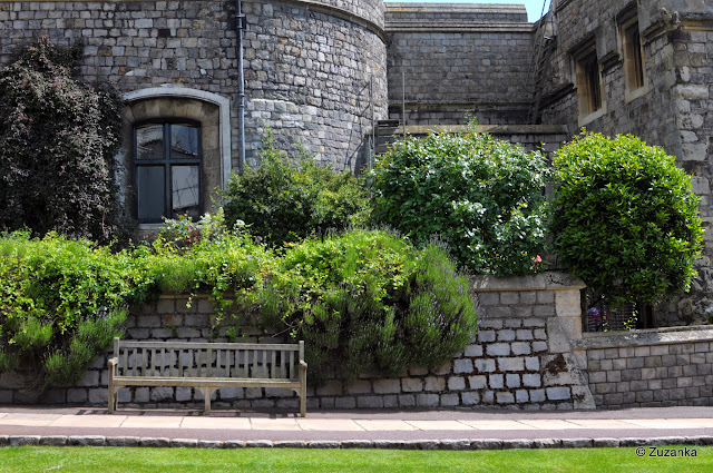 Świetne miejsce na letni piknik - w kawiarni można kupić prowiant, można też zabrać ze sobą - są stoliki, ławki i cudownie miękka trawa, po której (poza ogrodami formalnymi) można chodzić. W zamku nieco skromniej niż w Windsorze, chociaż może dlatego, że trasa wiedzie raczej przez kuchnię i dziedzińce niż przez salony. Na dziedzińcu z ogrodem król Henryk VIII z którąś z kolei żoną (raczej żywą, więc odpadają te zdekapitowane), w ogrodzie figurki zwierząt z proporczykami. I jak rozumiem byka, lwa czy nawet smoka, tak jaguar w kolorowe kropki wydaje mi się pewnym nadużyciem ziołowych dekoktów.