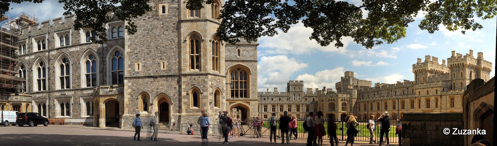 Małe, turystyczne miasteczko, pub Pod Głową Króla, strome uliczki, kamienice i sklepy z pamiątkami. I nad tym wszystkim Zamek. Chyba największy, jaki widziałam (a wikipedia mówi, że się nie mylę: 800 m długości, 19 baszt, powierzchnia podłóg wynosi ok. 45 000 m² - czujecie czas potrzebny na froterowanie parkietów?), a wszystko to dla kilku osób. I kilkuset osób obsługi (jak nie więcej). Niedelikatnością jednak wydaje mi się stawianie lotniska 16 km od siedziby, przecież królowa się tam nie wysypia, co chwila coś lata.