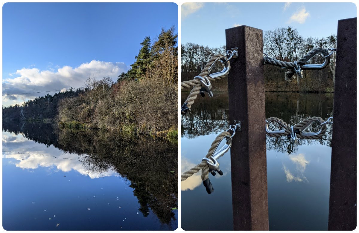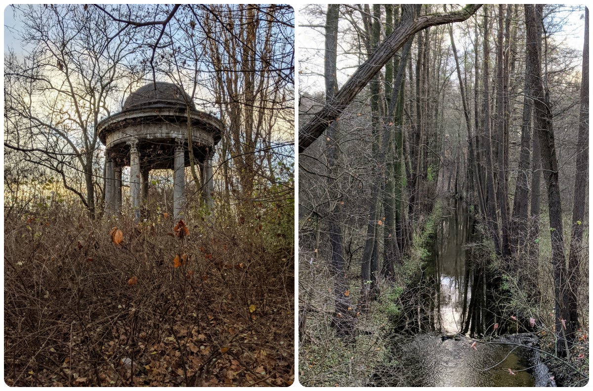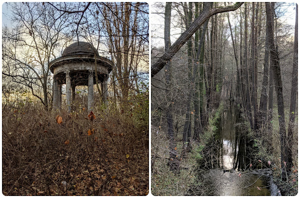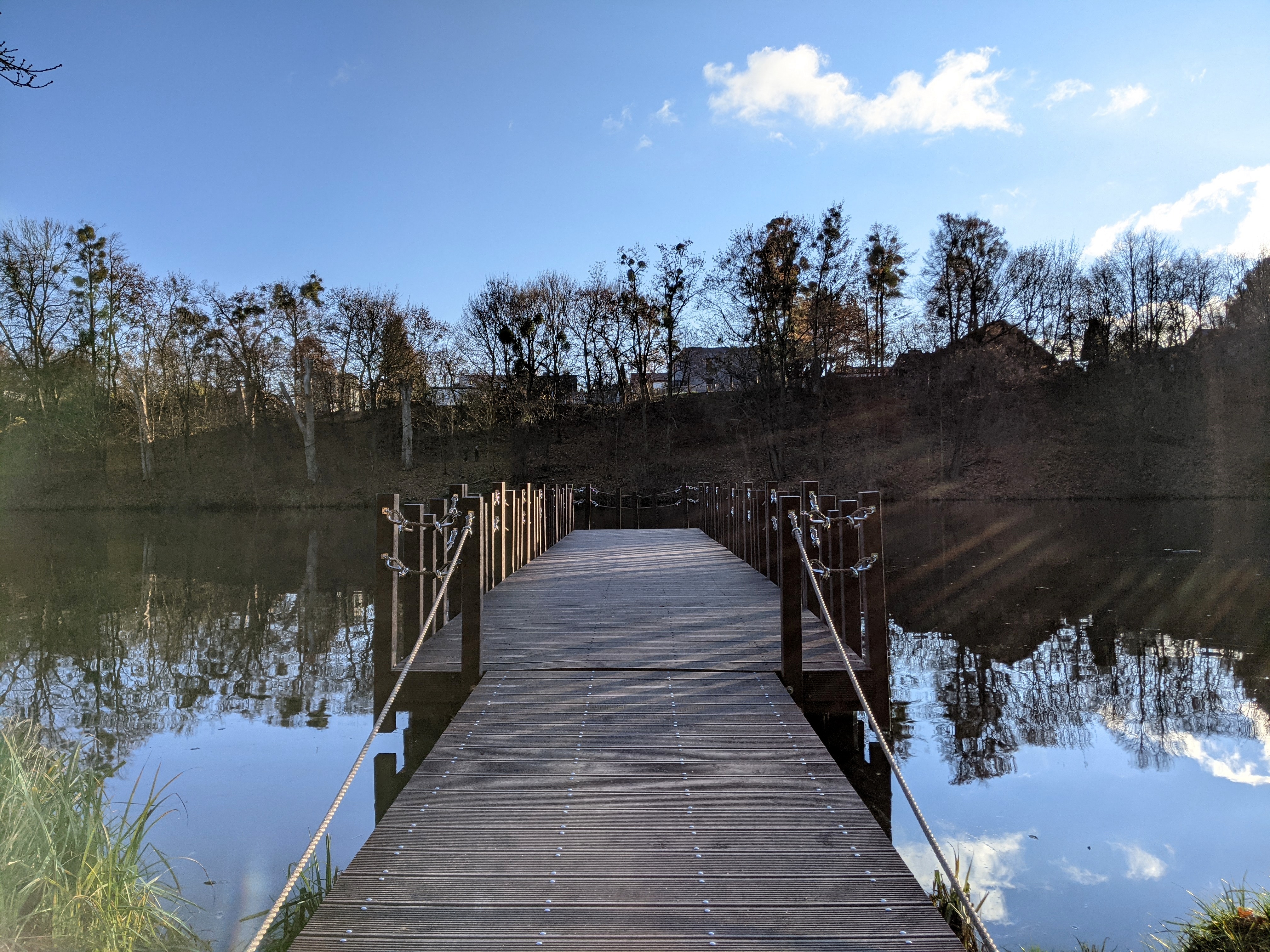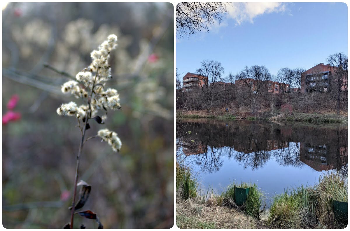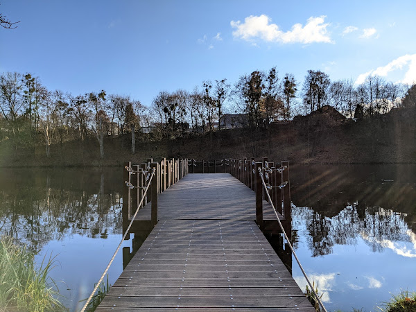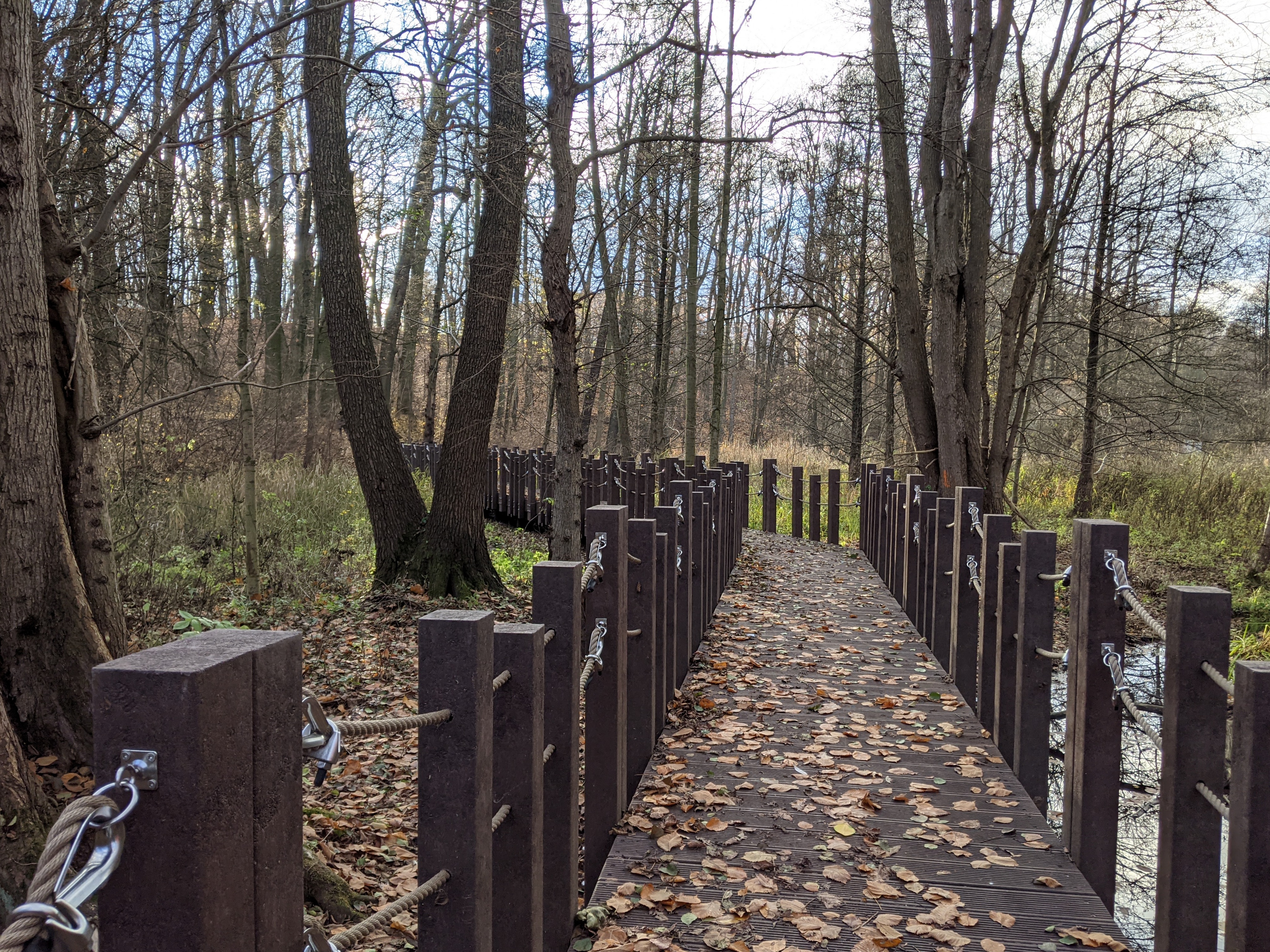 Zapewne przejdzie do historii moje pytanie, kiedy to - zastanawiając się, czy się zdrzemnąć po śniadaniu, czy jednak skorzystać ze słońca za oknem - zagadnęłam rodzinę, czy chce do ładnego lasu. Rodzina chciała. Las przy stawie Olszak w dolinie rzeki Cybiny zawiera niedawno oddaną ścieżkę przez bagna, ładną, ale nie za długą, więc kiedy dotarliśmy do przejścia do stawu Browarnego, rodzina dalej nie protestowała. Doszliśmy do pomostu, wymieniając złośliwostki na temat przepięknego osiedla z loftami w Starej Warzelni po drugiej stronie stawu, że absurdalne ceny, może i ładna okolica, ale psy dupami szczekają i koniec świata, kwaśne winogrona, te sprawy. Ale pięknie, niezaprzeczalnie. Wracając - chociaż można iść dalej wzdłuż stawu aż do uroczej huśtawki - wpadłam na przedni pomysł, żeby wrócić nieco dłuższą trasą, górą stawu Olszak. Tutaj rodzina już nie chciała bardzo, jak się potem okazało, zrobiliśmy prawie 5km (TŻ twierdzi, że ponad 6) i nawet widok Mauzoleum Mielochów i Nowego Zoo od zaplecza[1] jakoś nie poprawił im humorów. Mnie się podobało, bardzo. Żałowałam tylko, że nie wzięłam termosu z herbatą. Absolutnie wracam tam na wiosnę.