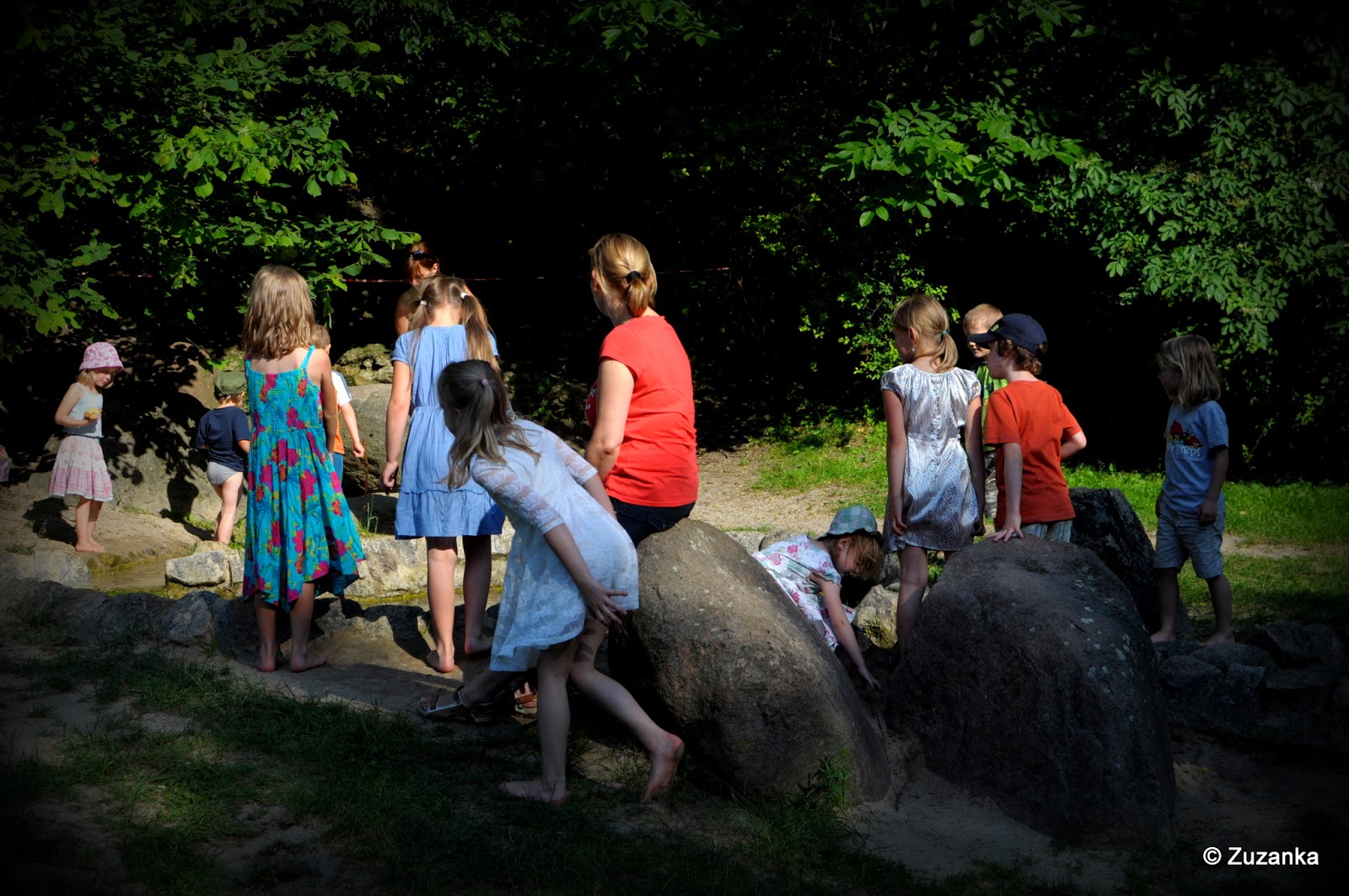 Oprócz tego był piknik (czy ktoś wziął talerzyki i widelce?!), chłodnik nabierany plastikowym kubkiem, strzelanie z czereśniowych pestek, zabłąkany rozkoszny biało-czarny kotek płci męskiej ("to dobze, ze to chłopcyk, bo ja się nie dogaduję z dziewcynkami" - wyjaśnił dziarski 4-latek), dwa konie z blond grzywami i strumyk, w którym okazjonalnie moczyła się połowa biegającej progenitury, również powodując dramy na tle zmoczenia wyjściowej sukni. Suknia madame była w miarę sucha, choć brudna; wianek został ciśnięty w strumyk, a madame zapytana o to, czy wyjdzie w tym roku za mąż, odpowiedziała "na pewno".