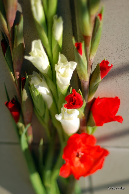 Zestaw w McDonaldzie, pewnie nawet powiększony. Ciuszek z przeceny. Kilka książek z Allegro, czasem nawet z przesyłką (właśnie się zorientowałam, że ponad tydzień temu wyklikałam ekwiwalent zostawionego rok temu w samolocie "Mr Vertigo" Austera i zapomniałam zapłacić, hańba mi). Dwie paczki świeżego bobu (jedna nie starczy na kolację dla mnie, TŻ i bardzo łakomego kota, któremu dodatkowo trzeba obierać ze skórki). I pewnie wiele innych mniej lub bardziej potrzebnych artykułów, ale mnie wystarczyło na 10 gladioli, zwanych też mieczykami z rynku Jeżyckiego[1].