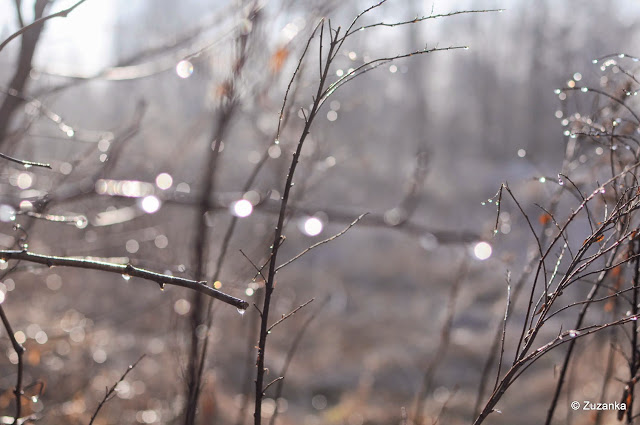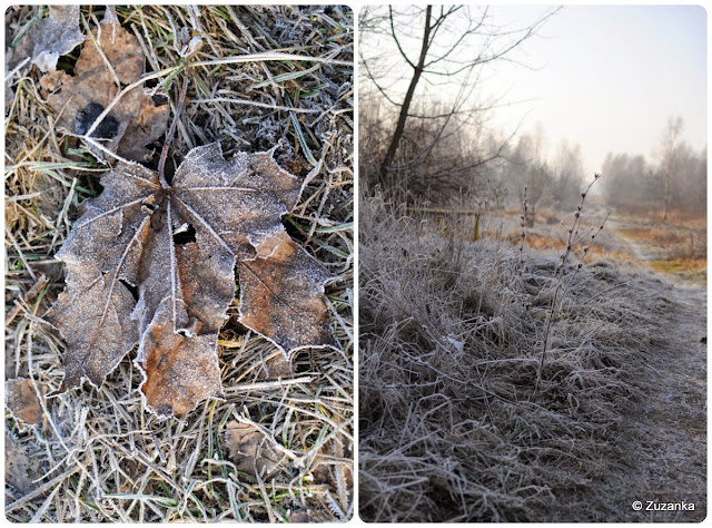 Kiedy wracałam, było już +1. Szron się zaczął skraplać, biel zaczęła znikać na korzyść brązu i zgaszonej zieleni roślin. Zatrzymałam się w kilku miejscach, żeby złowić światło, bokeh i resztki porannej mgły. Trochę przemoczyłam pantofle.