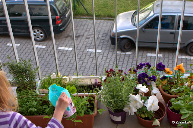10/11 maja. Z Targu Śniadaniowego przyniosłam posadzone przez Maja lewkonie, różową sałatę, dalie i dynię (dynia przeze mnie, nie mogłam się powstrzymać). A rzodkiewka już zjedzona.