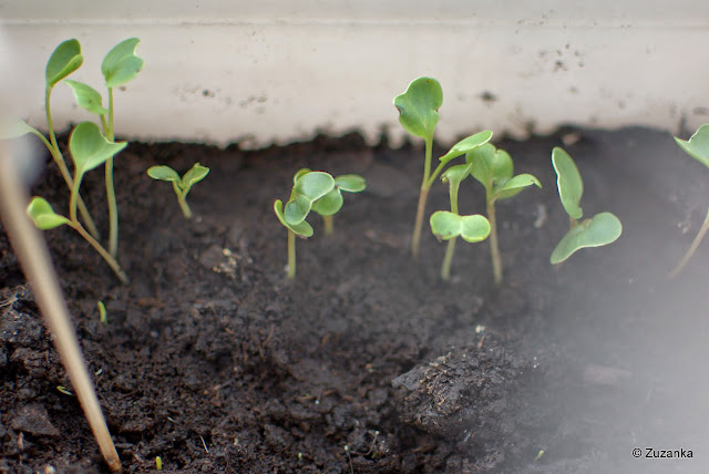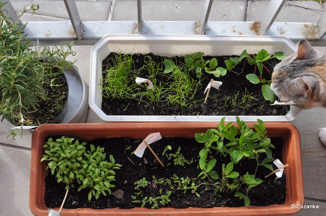 (od lewej od góry: rozmaryn (z Jeżyckiego), szczypiorki - siedmiolatka i drobny, rzodkiewka. Na dole czarnuszka, przypołudnik, groszek. I bohater drugiego planu)