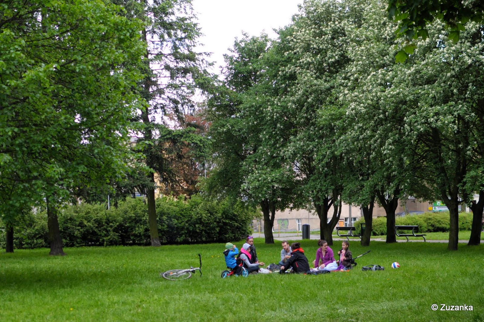 Co mi się ogromnie podobało: sama idea - zjedzenie publicznie śniadania, w parku, na ławce, z ludźmi. Spotkanie znajomych (czasem przypadkiem). Świetne jedzenie - od typowo śniadaniowego (twarożek, jajka, kiełbaski, naleśniki) do żywności eko, bezglutenowej czy nietypowej (suszone wiśnie, winegret w butelce, konfitury, owoce w czekoladzie, ciasta). Świetne napoje - soki jabłkowe z burakami, pomarańczą, gruszką - doskonałe. Po parkowej alejce przewalał się tłum, z dziećmi, psami (Maj najpierw zaprzyjaźnił się z sympatycznym brązowym pieskiem pani od Kolektywu Kąpielisko, który aportował patyk, potem zakochał w 2-miesięcznym szczeniaczku chihuahuy). Dzieci można było zagonić do sadzenia na stoisku Kolektywu, gdzie posialiśmy z Majem czerwoną sałatę, dalie, lewkonie i dynię (do balkonowej kolekcji, o czym niebawem) albo zapuścić w klocki. Impreza zdecydowanie ma potencjał, zwłaszcza z lepszą pogodą (chociaż infrastruktura - namioty, stoły i ławki umieszczone pod drzewami - pozwalała na siedzenie i w czasie deszczu).